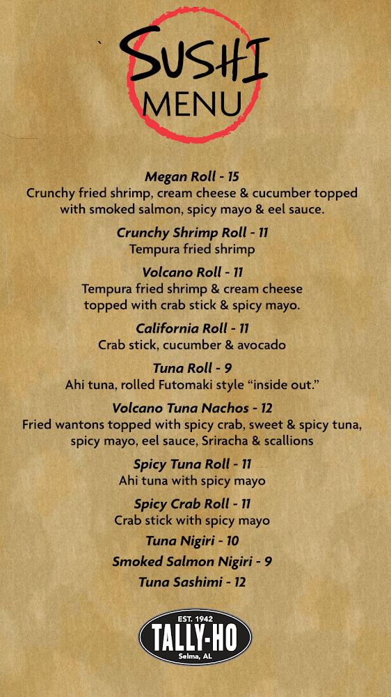 Tally-Ho's menu presents a delightful mix of American grill favorites and local specialties. Signature dishes include ribeye, filet mignon, and fried catfish. The restaurant also offers mouth-watering appetizers like the seafood royale and fried artichoke hearts.